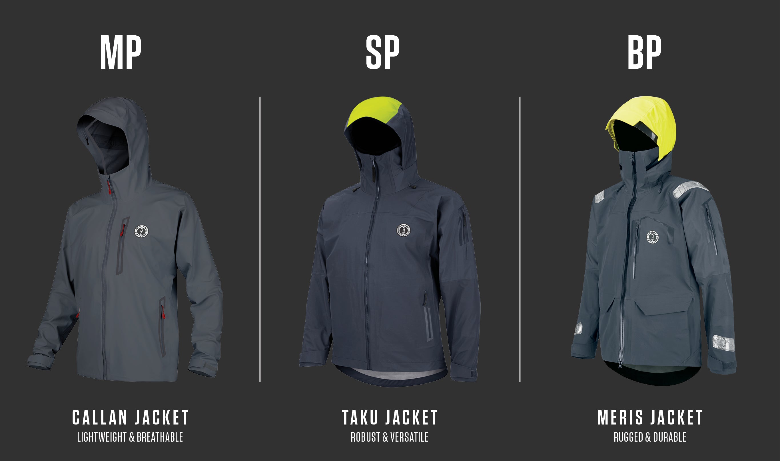 Our three types of Marine Spec Waterproof Breathable Fabrics (MP, SP, BP) are the result of a collaboration with leaders in the materials industry and rigorous testing at both the Mustang Waterlife Studio and real-world trials.